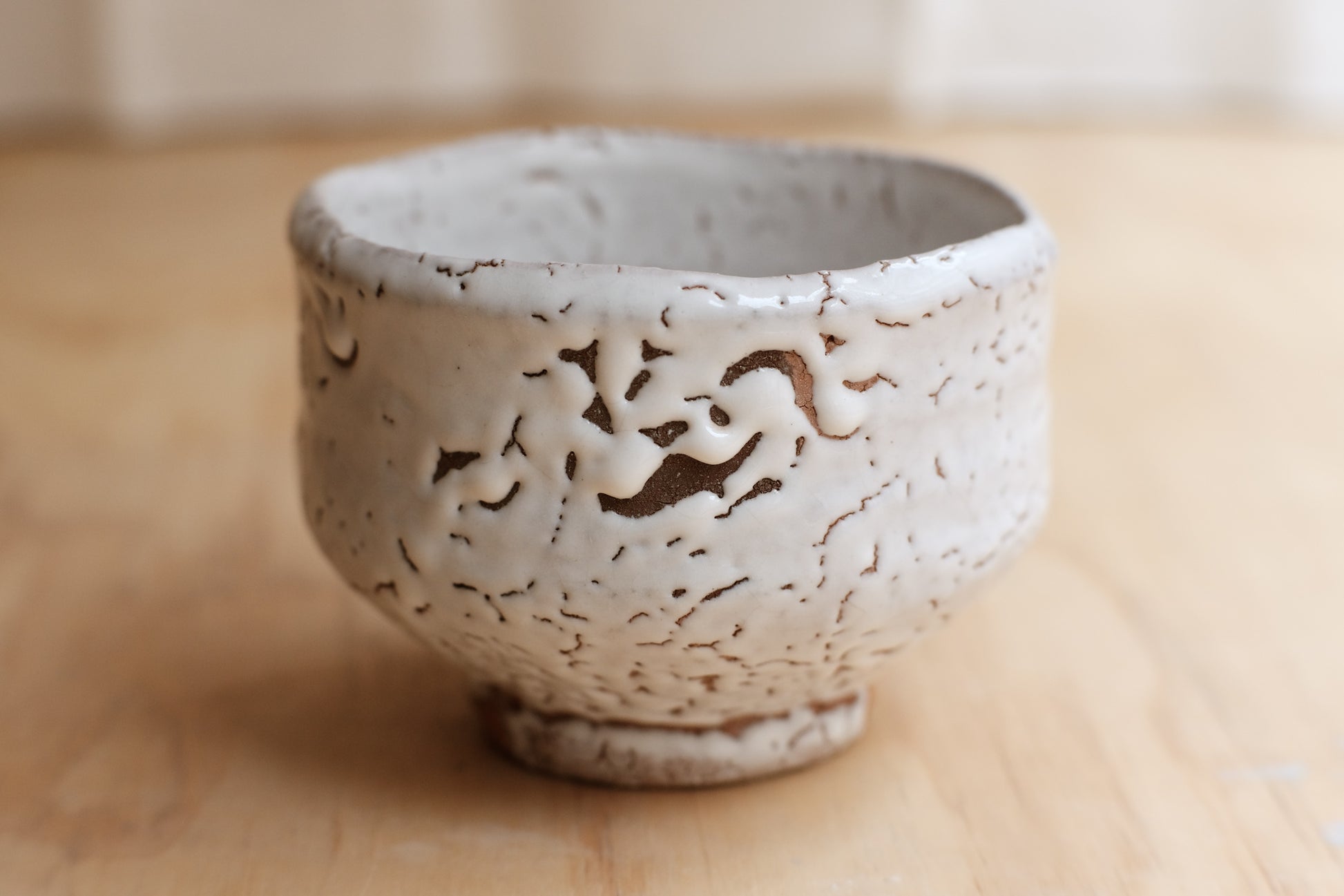 This hantsutsu matchawan by Kunisuke Nakahara has a bold white drippy glaze over a decorative underglaze and a nicely shaped foot.